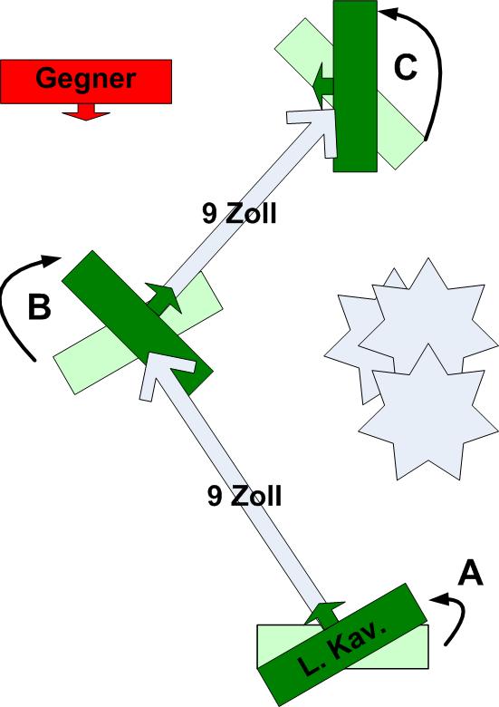 D.h.: An Punkt A wird eine Neuformierung durchgeführt und im Endeffekt wird die Einheit um die Mitte herum um fast 45° nach links gedreht. Dann eine Bewegung von 9" nach vorne bis Punkt B und da wieder eine Neuformierung, um sich nach rechts auszurichten. Weitere 9" Bewegung bis Punkt C und abschließend auf der Stelle drehen (Neuformierung) und nach links ausrichten.