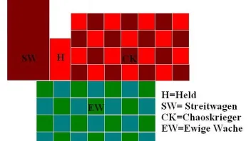 Die Chaoskrieger schaffen die Nahkampfbewegung nur unter der Bedingung, dass sie sich gerade darauf zubewegen und dann an die ewige Wache ranklappt. Hierdurch wird besteht dann allerdings nur noch platz für höchstens den Hero zu Ross, nicht mehr für den Streitwagen.