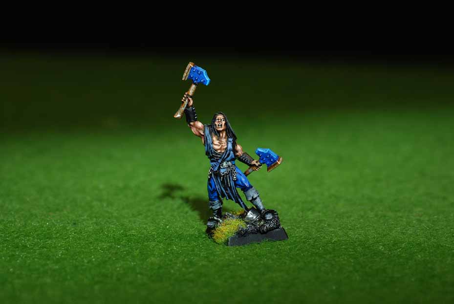 das "blauere" blau ist regal blue, enchanted blue und dann am ende noch ice blue dadrüber, ultramarine blue geht auch, wahlweise hochmischen, hauptsache ein kräftiges gesundes blau. das andere ist shadow grey und eine mischung aus ca 1:1 shadow und space wolves grey. falls ich die mini noch heller haben möchte in der zukunft behalt ich mir einfach vor noch ne akzentfarbe space wolves grey drüber zu ziehen