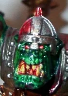 Nachdem ich die Zähne mit Elf Flesh grundiert habe, bekamen sie einen trocken gebürsteten Effekt durch Bleached Bone verpasst. Nun habe ich die Zähne mit Red Ink überzogen. Sah natürlich nicht so doll aus. Also habe ich die überschüssige Farbe wergepustet, was den erwünschten Effekt voll und ganz erfüllte. Die Pigmente der Red Ink sind nun als Zahnfleisch in jeglicher Ritze drin. Und der Ork hat schöne gelblich abgenutze Zähne, die schon so manchen Störenfried in der Nähe gekostet haben ![]()