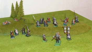 • Tja, das helle Grün bringt das Schwarz-Rote Farbschema meiner Fusstruppen so richtig schön zur Geltung. Ich hatte zwar noch überlegt, ob ich ein dunkles Blau, wie bei der Armee des Nordens im AB nehmen soll hab mich aber dann dagegen entschieden. Und ich finde, das ER's schon ein bisschen mehr Gold verdient haben. Also ist ein Schwarz-Rotes Farbschema wie bei den Normalos nich so angebracht.