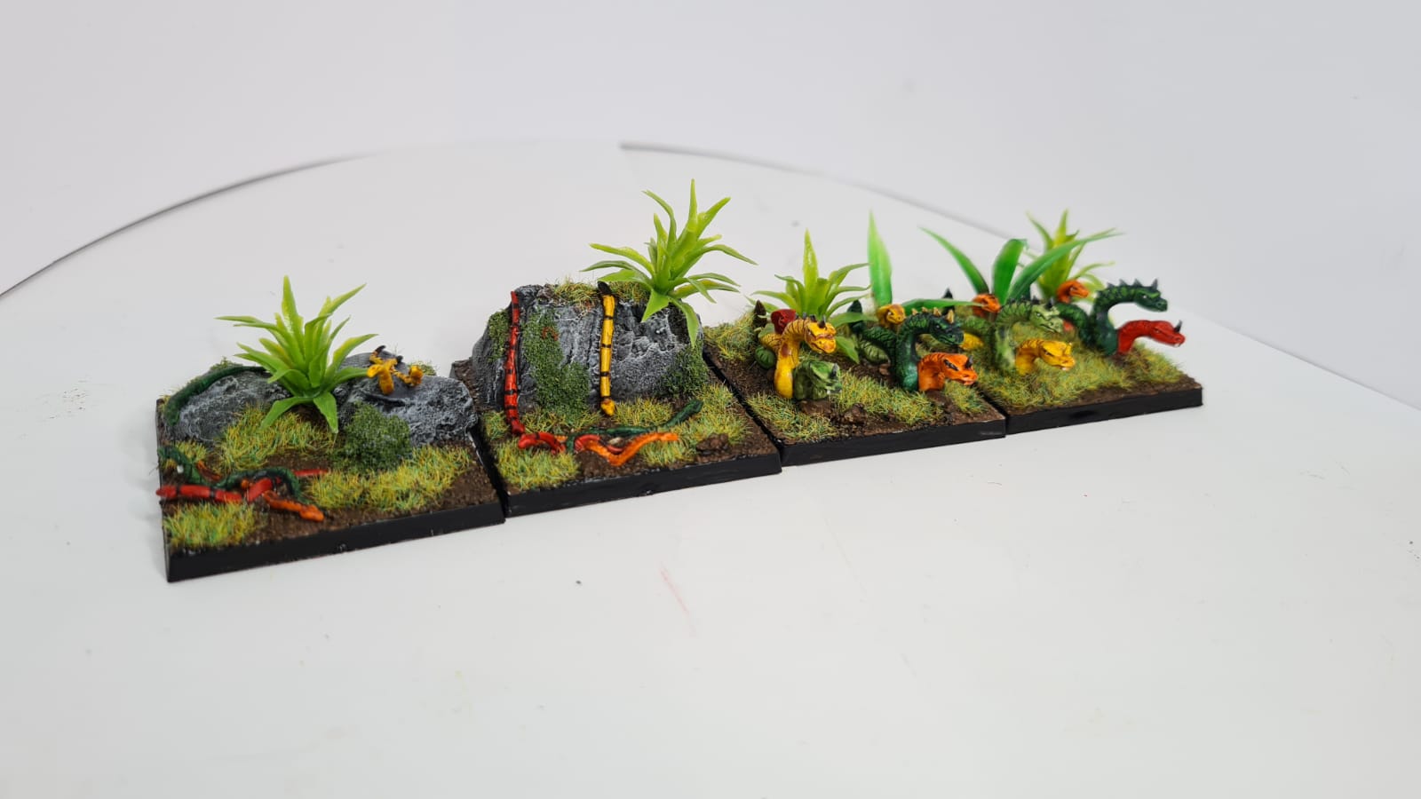 Die Idee find ich auch sehr gut. Hab mir schon Gedanken gemacht, wie man die Schlangen des Bastiladons halbwegs gut als Dschungelschwarm nutzen kann, da die ja doch eher unnatürliche Posen haben. Hatte bisher diese recht offensichtliche Variante gesehen