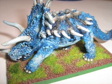 Mit dem HN habe ich aber grad so ein bischen mühe, sind da einige Hörner auf dem Rücken noch Blau? Liegt vllt auch nur am Foto. und seine Base scheint noch nicht fertig, da würd ich den Sand auf jeden fall noch bräunen.