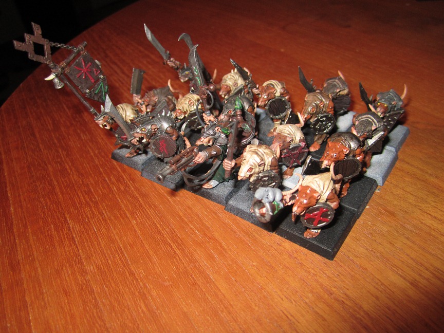 Um die Bases hab ich mich bis jetzt erfolgreich gedrückt, das werde ich ganz am Ende machen. Im Moment male ich vor allem am Todesrad und das wird wohl auch noch ein paar Monate dauern. Das ist ja wirklich sau schwer anzumalen. Zum Ausgleich und für das Erfolgserlebnis streu ich ab und zu mal wieder ein paar Clanratten ein.