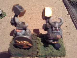 Allgemein waren Zwerge ja immer schon gepanzert und das hat auch ihre Farbgebung beeinflusst. Neben Metall und Gold hatten die früheren Zwerge sonst meist nur erdige Farbtöne wie Grün und Braun, andere Farben hätten sich mit dem vielen Metall gebissen (so wie die neuen Klankrieger, die vom GW bemalt wurden... die kann man so doch echt nicht ernst nehmen...).