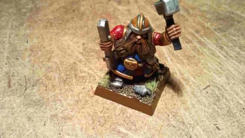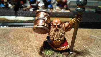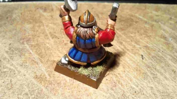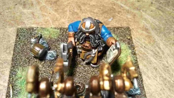 Du solltest aber auch darauf achten, was an den Modellen modelliert ist. Wenn du die ledernen Handschuhe der Schildträger in Metallfaben bemalst sieht das recht komisch aus und verkommt mit dem Rest der Miniatur zu einem leichten Einheitsbrei, weil Zwerge eben viel Rüstung haben. Warum hast du die Handschuhe nicht in dem blau vom Schild bemalt? Daduch bekommt das ganze Modell, welches ja aus drei Komponenten besteht, eine gewisse Zusammengehörigkeit.