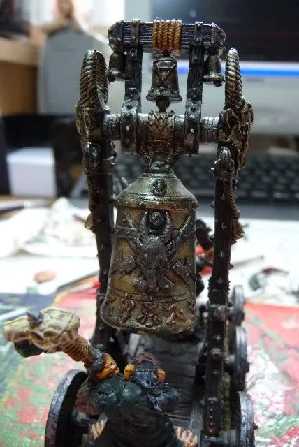 also man kann Glocken sicherlich nicht nur bronzen malen. Denkbar wären noch (für eine echte Lawinenarmee, bei der man die Bestandteile kaum auseinander halten kann) normale etalltöne. Bronze in dunkel entspricht dem verwitterten Naturell der Skaven, eine heller Variante würde jedoch die exponierte Stellung der Glocke hervorheben.