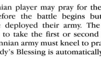Um den Segen zu erhalten muss die ganze bertonnische Armee beten, darauf hin darf dann der Gegner entscheiden ob er den ersten oder zweiten Spielzug nimmt (es wird nicht gewürfelt wer beginnen darf).
