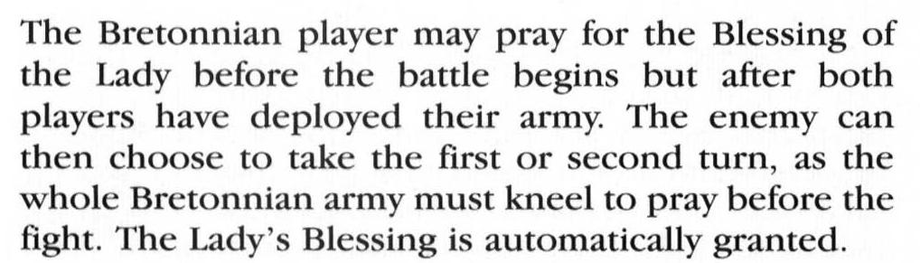 Wenn du dich dazu entscheidest nicht zu beten, dann würfeln beide Spieler wer zuerst beginnen darf (die bretonnische Armee erhält dann allerdings keinen Segen).