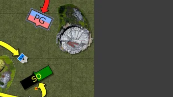 Die So können keinen Angriff auf PG ansagen, weil der Umlenker V im Weg steht. Greifen die SO den V an, richten sie sich an ihm aus. Wenn die Einheit V fällt, stehen die SO also günstig für einen Angriff durch PG. Sogar wenn SO überrennen, laufen sie durch die neue Ausrichtung an PG vorbei.