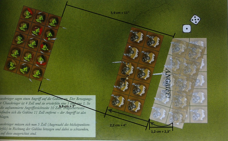 Im Bild sind die Einheiten 6cm Entfernt, und die angreifende Einheit bewegt sich etwa 2,2cm vorwärts, und macht einen Schwenk von ungefähr 1,4cm.