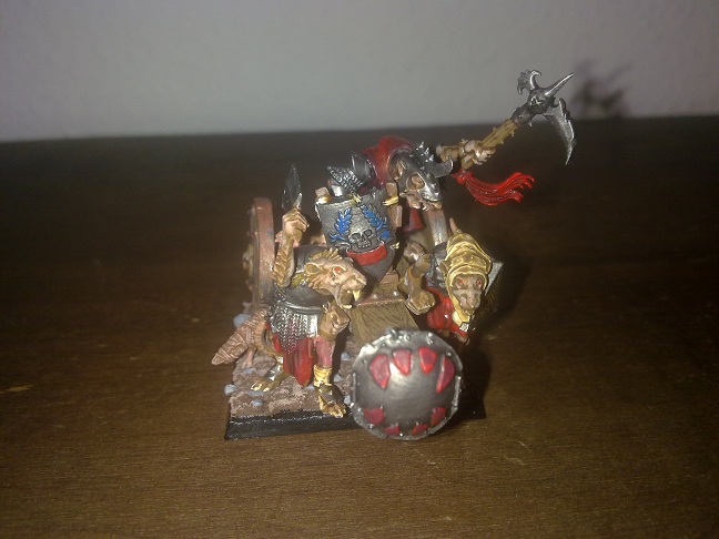 Also den einfachsten Knochenreisser- Rattenoger kannst du darstellen, indem du einen normalen Rattenoger nimmst (vorzugsweise der am bedrohlichsten aussehende), und evtl. etwas höher positionierst durch Basegestaltung. Dann einfach nen Kriegsherren drauf mit Kette, die um den Hals des Knochereissers führt und fertig. Den Rattenoger dann etwas bedrohlicher (dunkler), bzw. anders als den Rest bemalen und eventuell durch ein paar Bitz personalisieren und bedrohlicher machen...