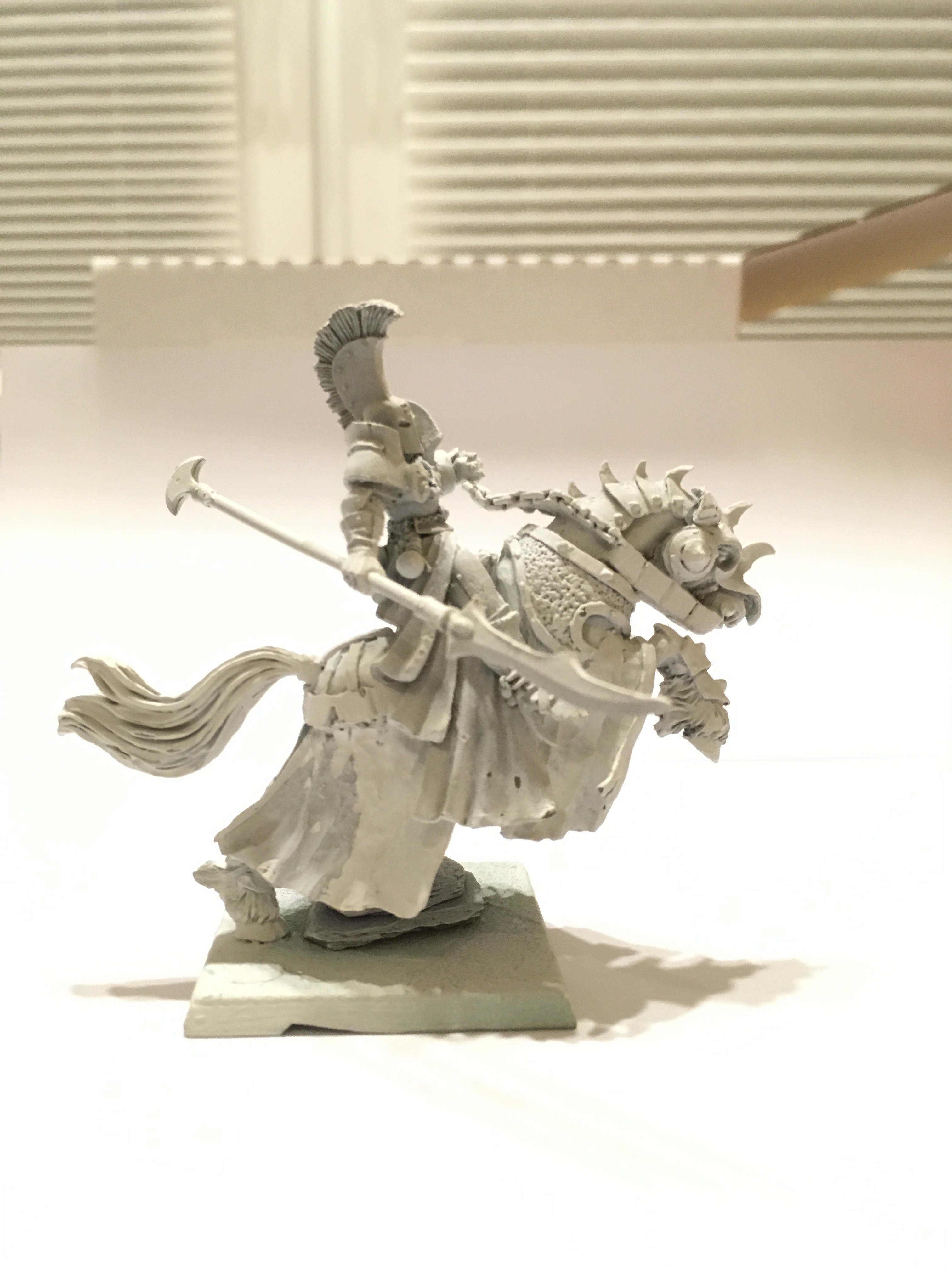 Nen Khorne Chaosgeneralspferd ohne Schädel an Ketten in den Falten der Pferdedecke mit leicht angepassten Chaosgeneral des Slanesh .