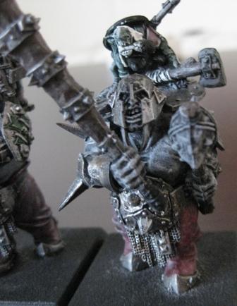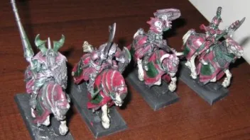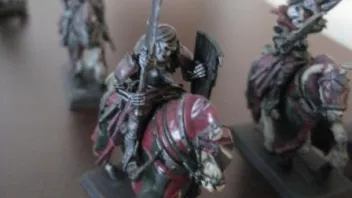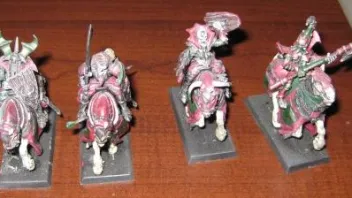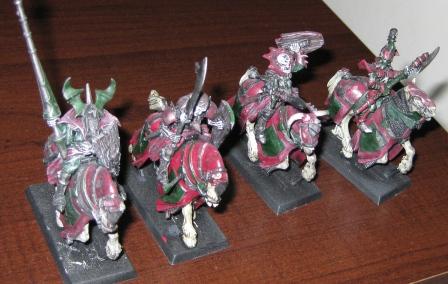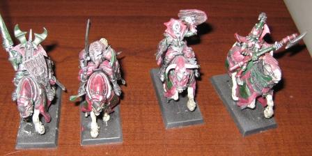 Blutritter: aus Bretonenpferden und Beinen, auf einem sitzt ein Inkubbi der Deldar, die anderen oberkörper und Waffen sind teils von Elfen, einer is sogar von ner Standarte (der mit dem Extrabild, der hat auch nen Pfahl durch die Brust). Die Arme und Köpfe und Waffen wurden von Skelettkriegern, Verfluchten und Zombies benutzt.