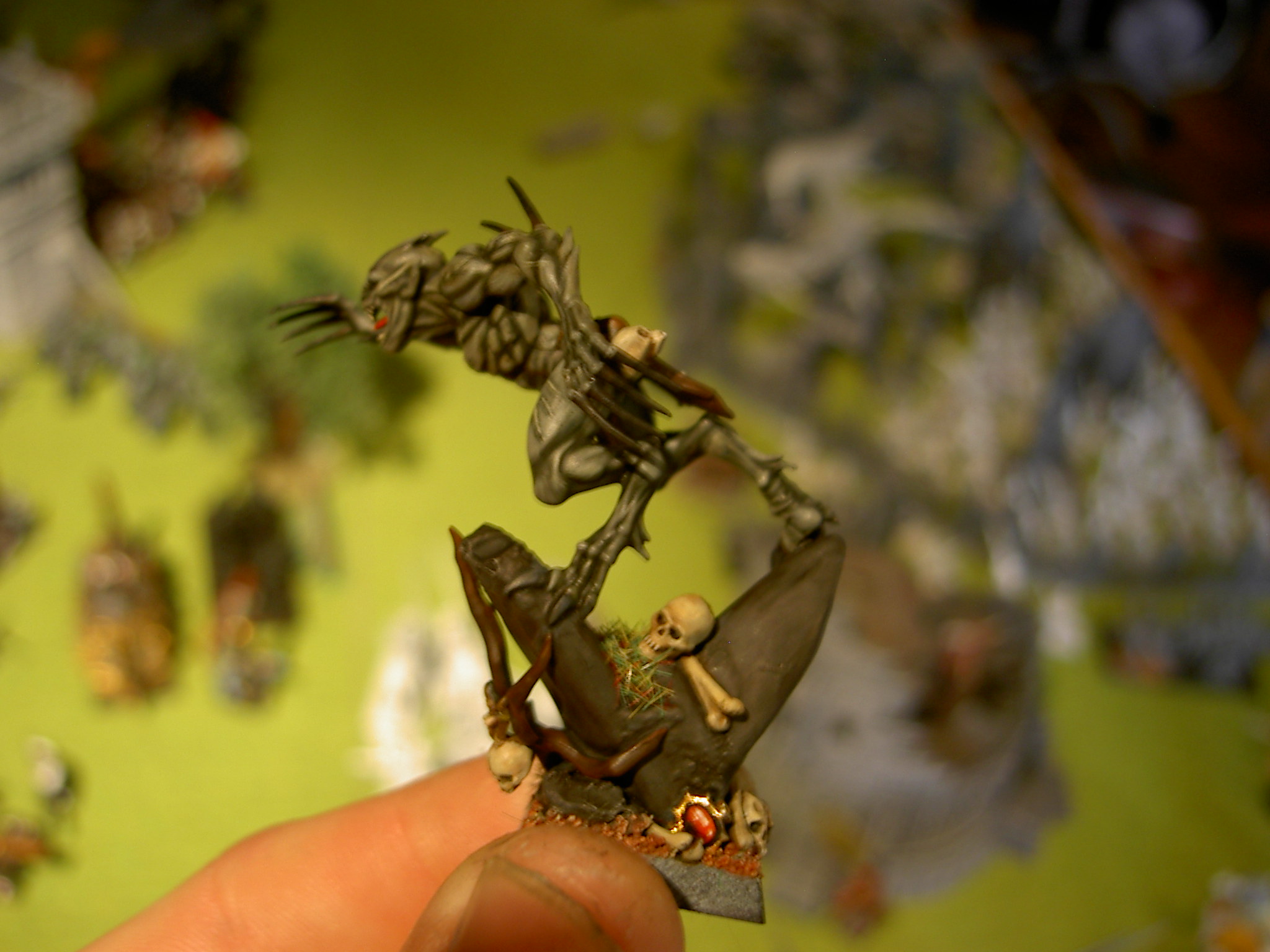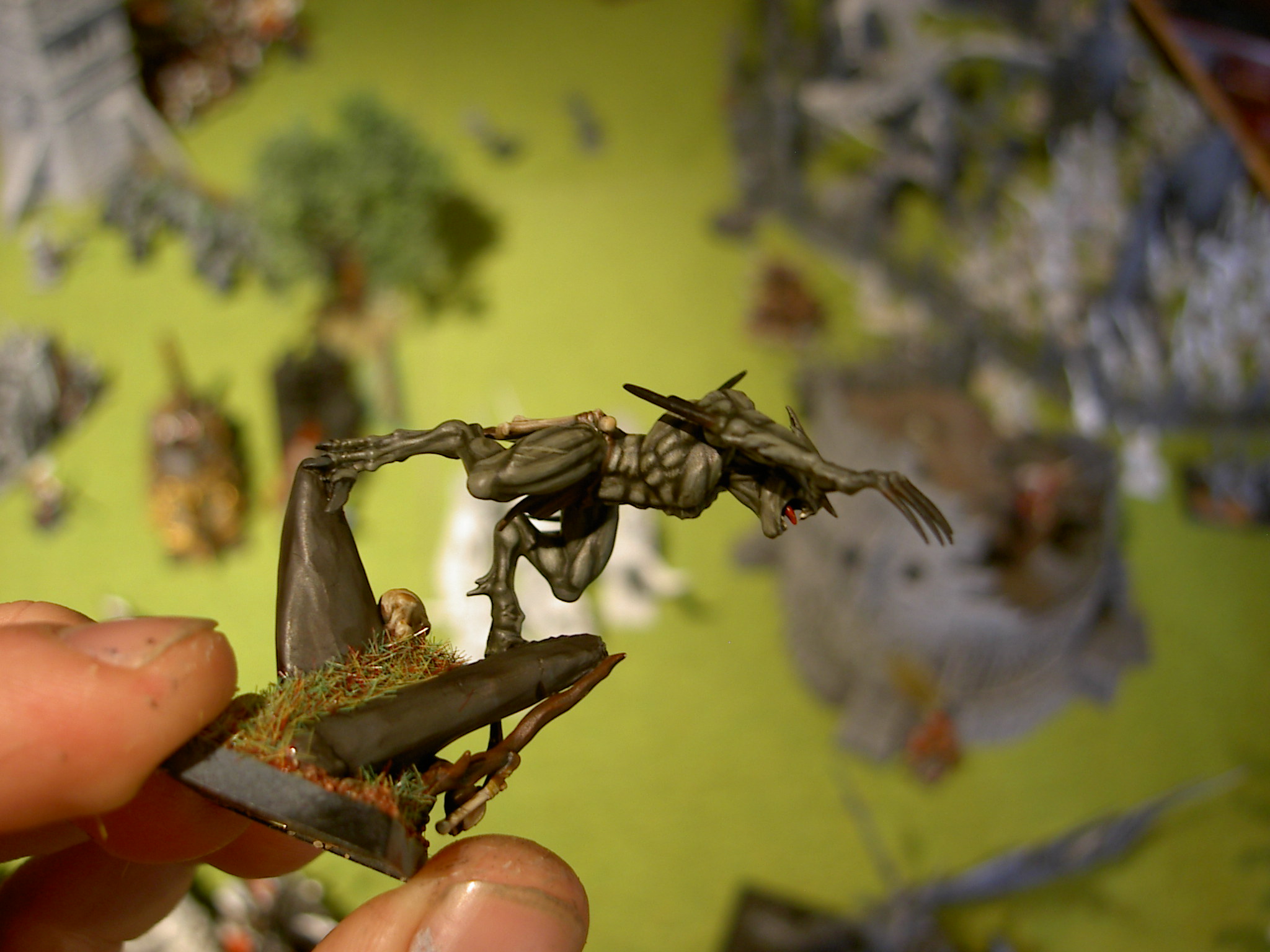 der Kopf besteht nahezu komplett aus Green Stuff, auf dem ersten Bild ist er in einem sehr frühen Stadium zu sehen (der unförmige grüne Klumpen links neben den Dämonettenklauen welche später das Grundgerüst für die Hörner bildeten).