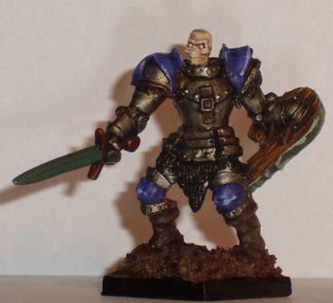 Verdutzt sahen sich die Männer um und warteten, darauf, dass etwas geschah. Ein weiterer Blitz fuhr über den Himmel und wurde von tiefem Grollen begleitet. Wie aus dem Nichts stand auf dem Steinhaufen eine Gestalt in schwerer Rüstung, in der einen Hand ein Schild und in der anderen eine gespenstisch glühende Klinge. Der Kopf war ein blanker Schädel und aus den Augenhöhlen kam ein grünes Leuchten. „Ihr werdet sterben und dem Meister dienen!“ keuchte der Untote und schritt langsam vom Steinhaufen und auf die Männer des Hexenjägers zu.