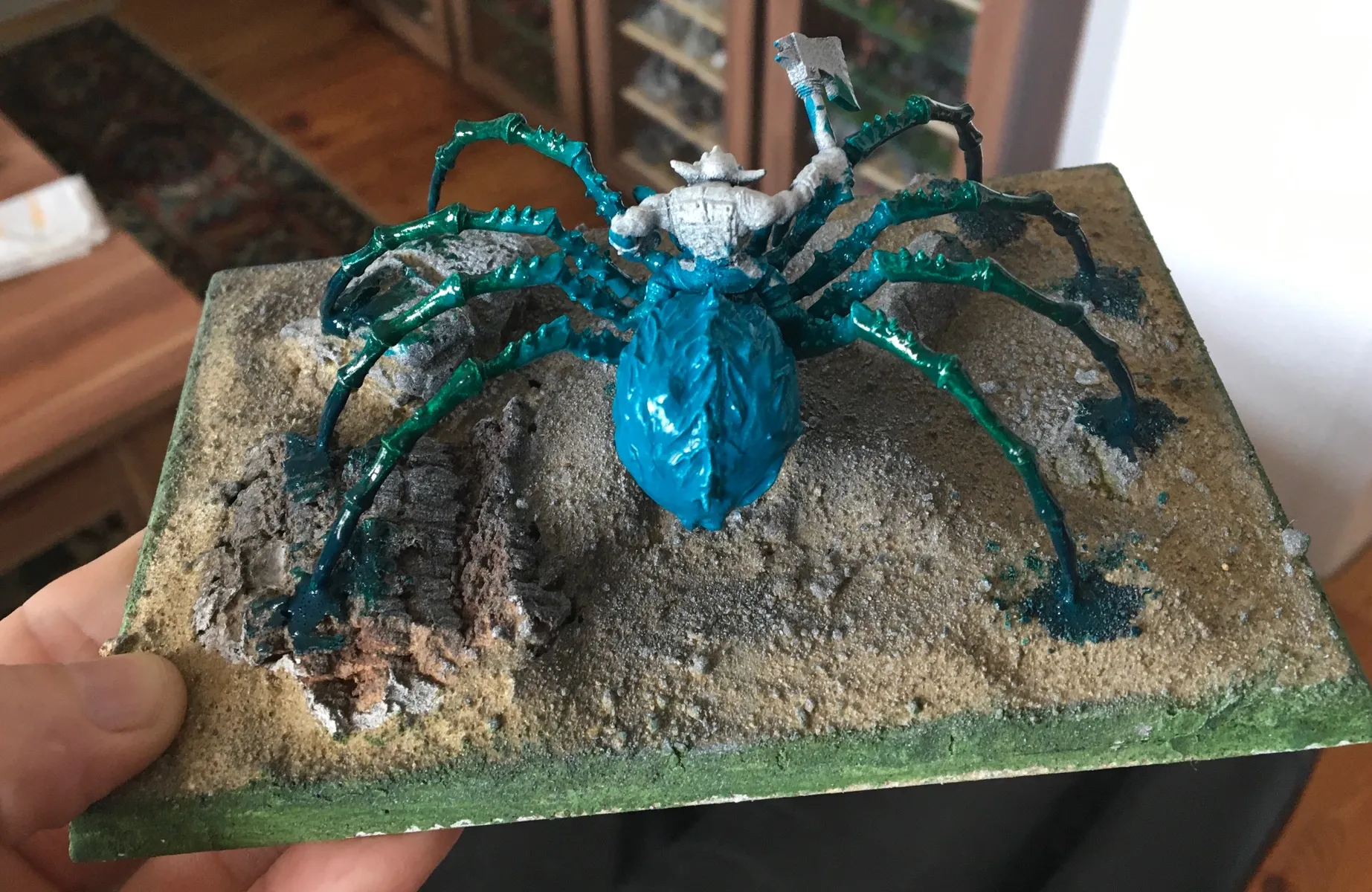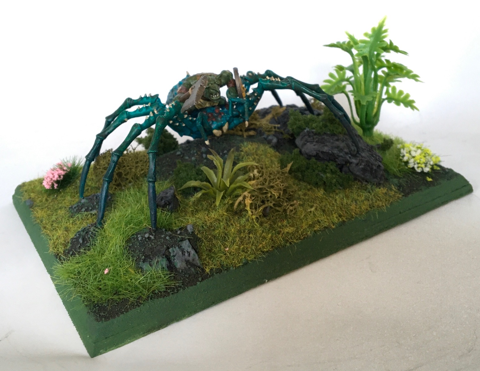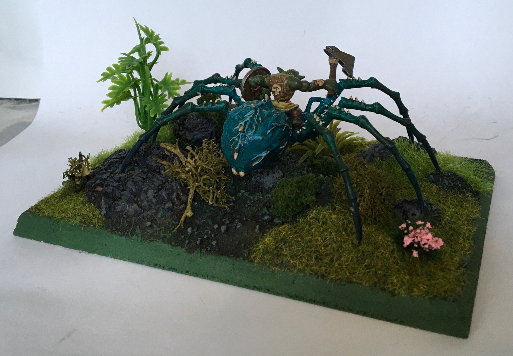 Den Anfang macht mein Goblinheld auf Gigantenspinne. Die Spinne ist von Heresy, der Goblin umgebaut.