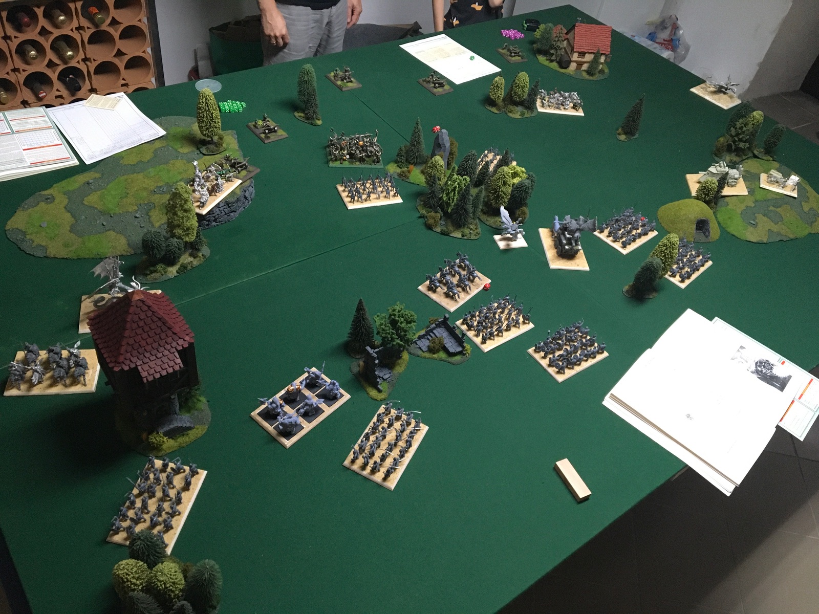 Bei der Startaufstellung hab ich (habe rechts gespielt) schon verhunzt. Meine Höllenfeuersalven-Kanone stand richtig mies, und meine zentralen Einheiten haben sich selbst blockiert. Zu den anderen Armeen gebe ich lieber keine Statements ab, dazu war ich zu sehr mit meinem Schlachtplan beschäftigt.