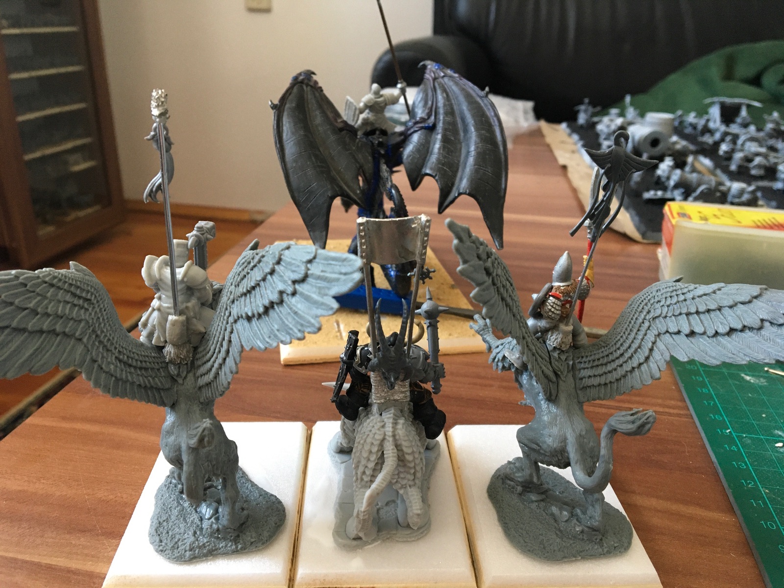 Außerdem bekam ich am Abend eine Lieferung. Heute hab ich daraus einen Chaosgeneral auf Khorne Moloch gebaut, einen Hochelfen auf Greif (Eltharion), und einen Imperialen (mein Karl Franz quasi)