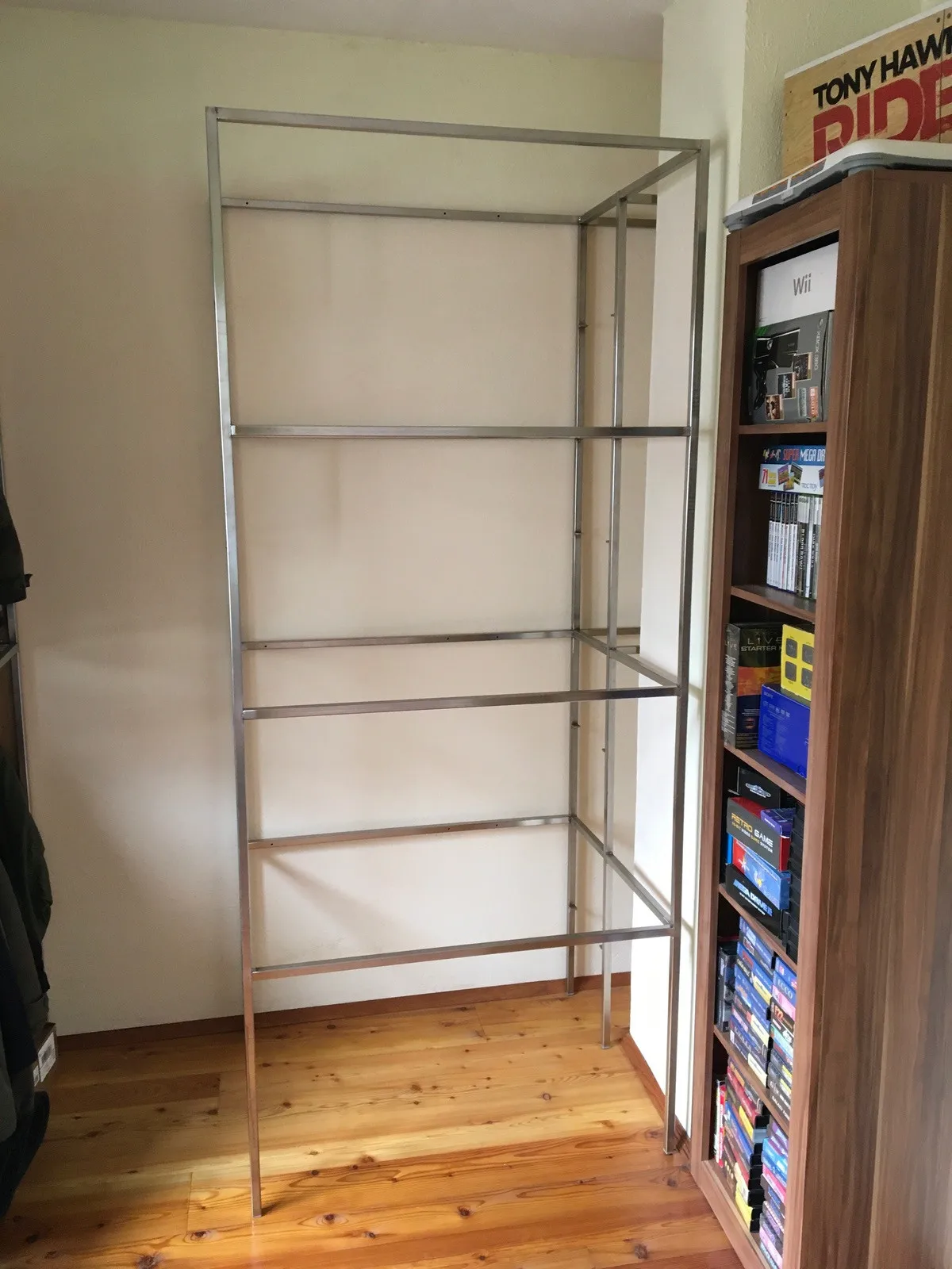 Ein bisschen off topic, aber diese Woche und die nächste geht nicht viel weiter. Ich hab mir einen neuen offenen Schrank geschweißt, und jetzt muss ich noch die ganzen Holzplatten zuschneiden…