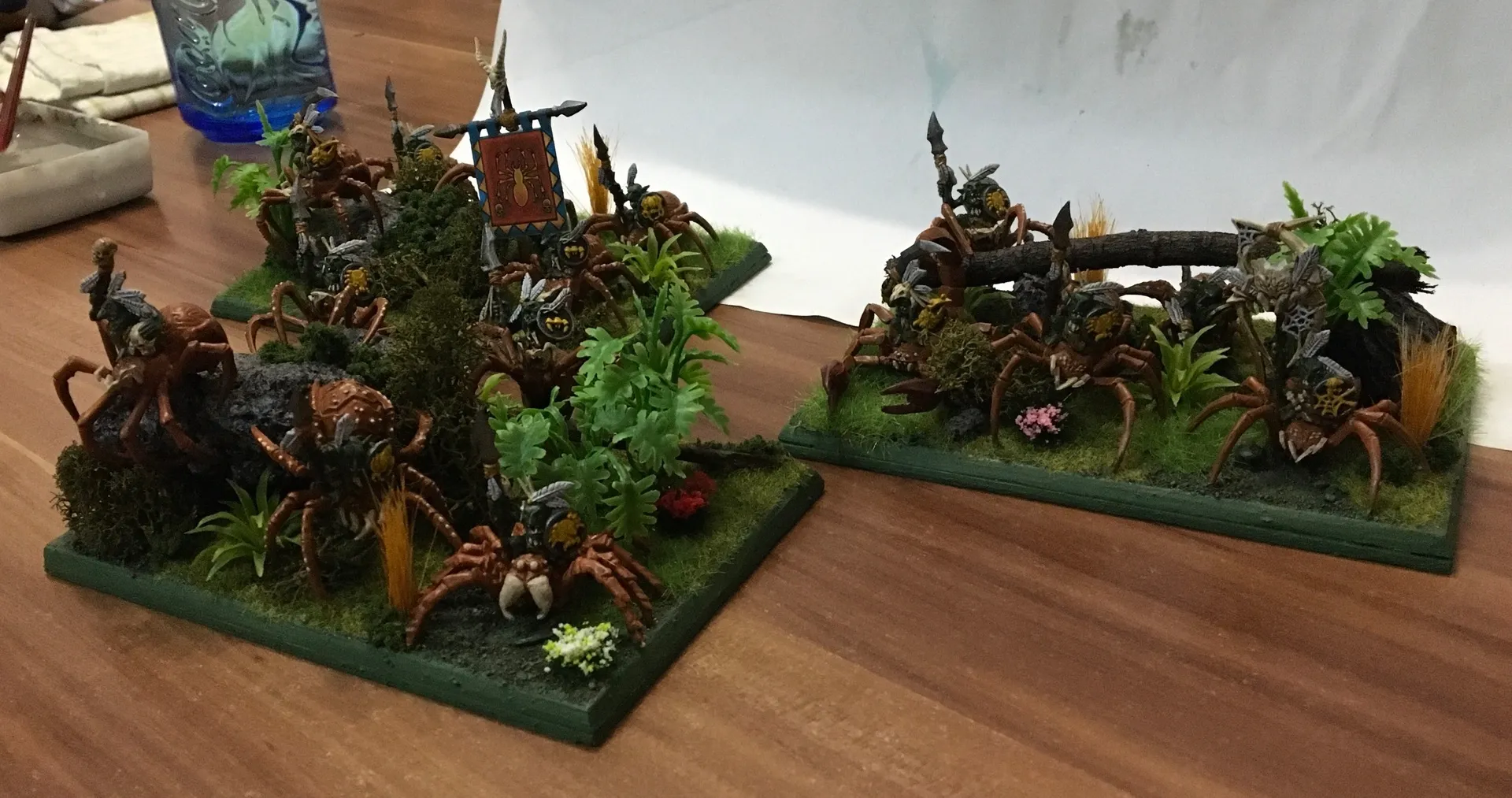Ich versuche immer den Charakter einer Armee darzustellen. Bei Menschen, Zwergen und Elfen kommen alle Modelle in Reih und Glied auf die Bases. Bei den ungestümen Völkern mache ich eine wilde Formation. Bei den Spinnen bot es sich wirklich an, diese hinterhältige Art, wo man nie weiß was aus dem nächsten Busch kriecht, darzustellen 😄