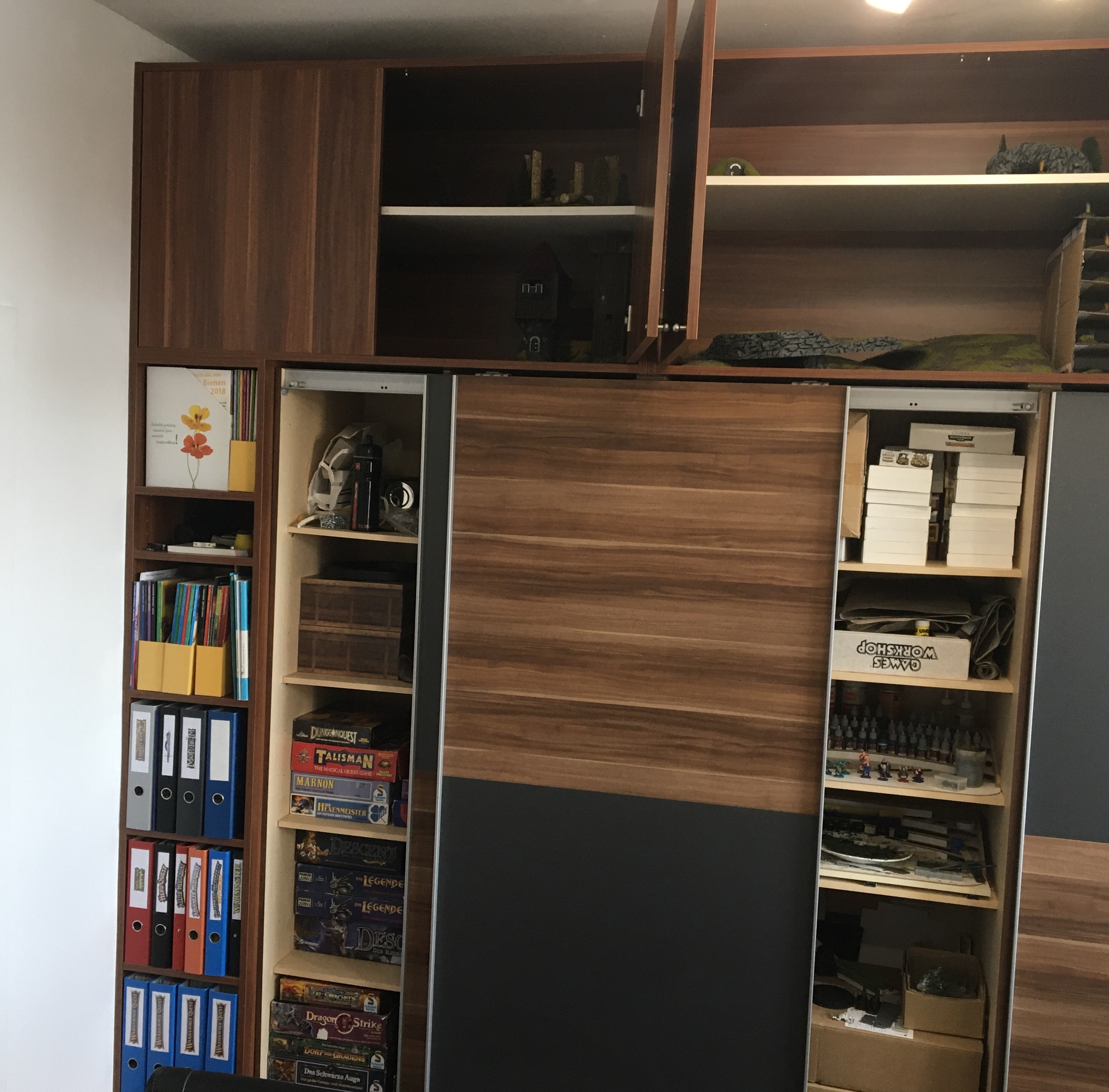 Sobald man rein geht, ist linker Hand ein Wandverbau. Dort hab ich ein offenes Regal für die Regelwerke. Der Schrank daneben hat eine Seite voll mit den Brettspielen und Dungeon Crawlern, die rechte Seite ist für mein Bastelzeug. Darüber hab ich noch kleine Schränke anfertigen lassen, in denen befindet sich das ganze Tabletop Geälnde.