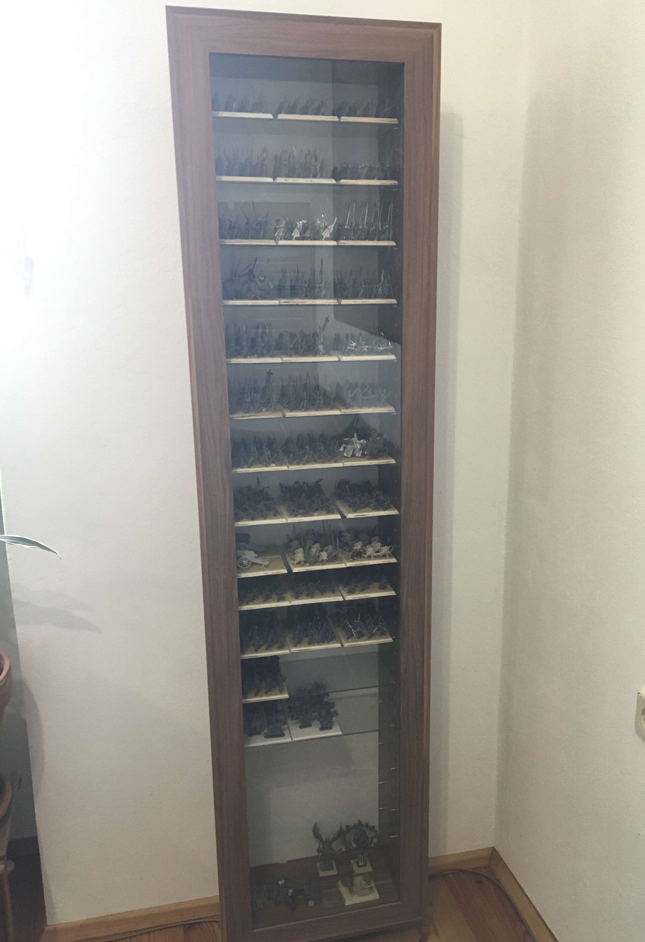 Im Eck der Wand steht noch eine einzelne Vitrine, und gegenüber die anderen 5. Diese sind voll mit unseren Armeen auf Einheitsbases. Wir haben mittlerweile: Untote, Zwerge, Orks, Goblins, Chaosbarbaren, Chaoskrieger, Tiermenschen, Elfen, Menschen, ein paar Ratten, Echsenmenschen und Chaoszwerge, und natürlich allerhand an Kriegsgerät dazu ![]()