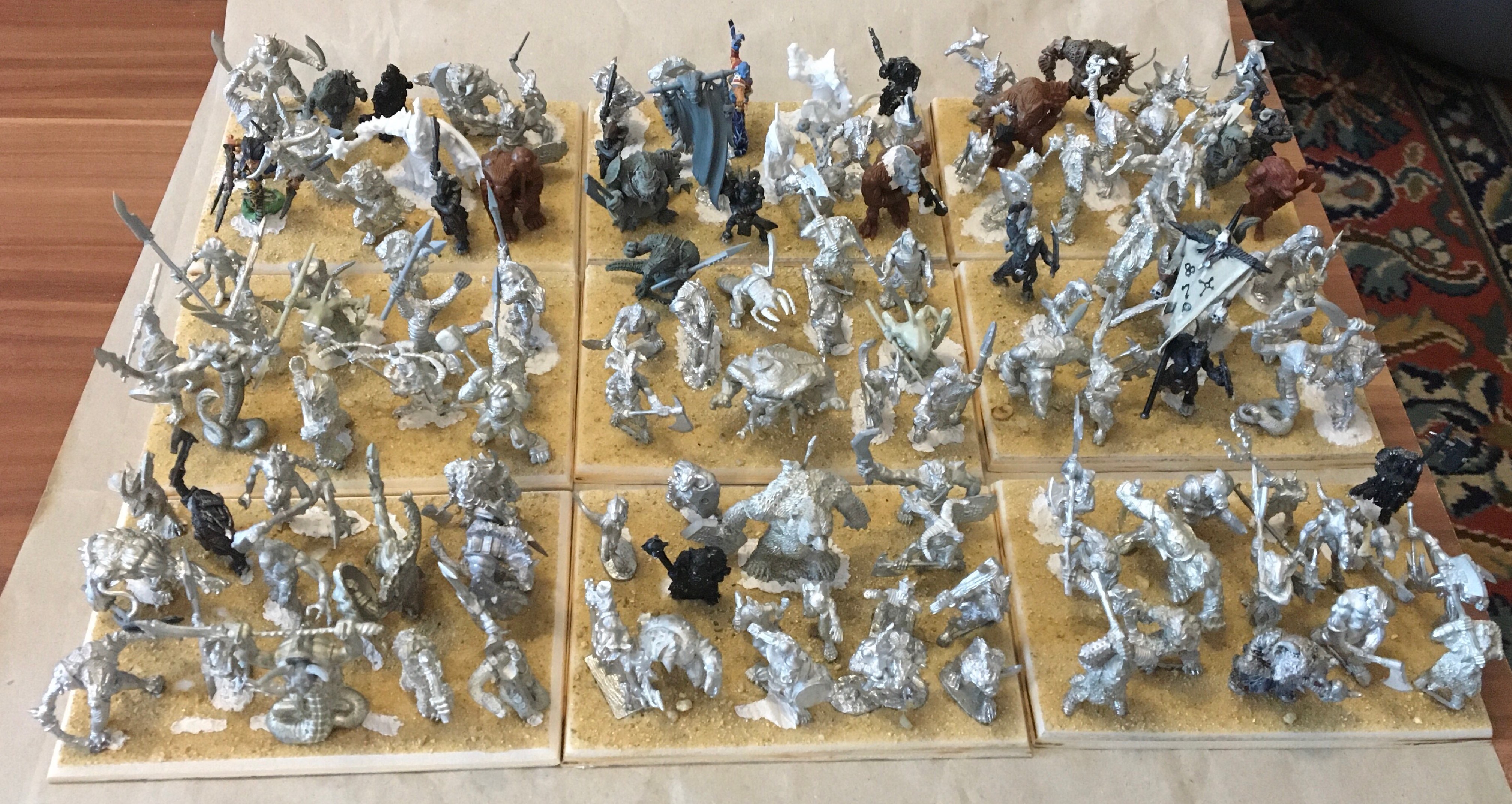Ich fange mit Chaos an, da es mich am meisten Zeit kostete. Ich hab wohl knapp 2 Jahre dafür gebraucht. Am Ende sieht es vielleicht unscheinbar aus, aber ich habe alle Bases neu gemacht, dh alle Miniaturen neu verklebt. Das gilt nicht nur für die Krieger. Bei den Barbaren kamen etliche Fremdhersteller dazu und die Tiermenschen hab ich komplett neu aufgebaut. Da bekam ich einfach nur einen Wäschekorb voll Zip Bags von meinem Bruder ![]()