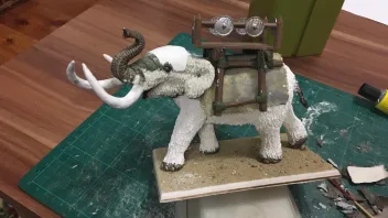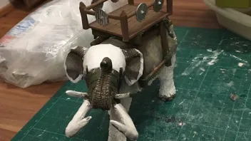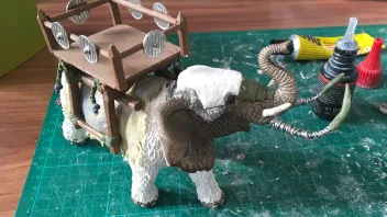 Kleiner Fortschritt: ich hab den Unterbau der Stoßzähne gemacht und den Helm um 1 Platte weiter in den Nacken verlängert. Und ein paar weitere kleinere Verbesserungen an der Howdah