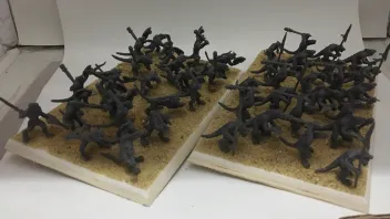 Den Anfang machen meine Pseudo-Skinks von Caesar Miniatures. Ich hab die zuerst gekauft, weil sie spottbillig waren. 11,- für 44 oder sowas in dem Rahmen. Sie bestehen aus 2 Regimentern mit den Waffen die sie standardmäßig hatten.