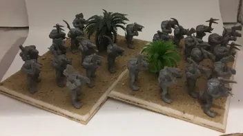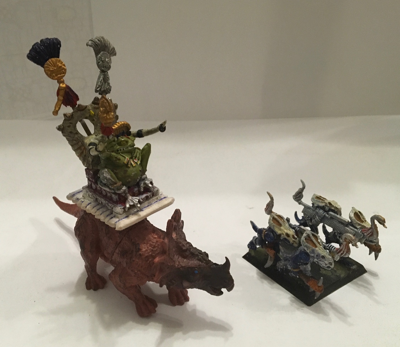 Der Triceratops ist quasi mein Stegadon, er bekam 2 Skinks und eine Speerschleuder. Diesen habe ich auch im letzten Testspiel schon verwendet. Oder besser gesagt mein Neffe, er ist wohl grad in der Dino-Phase und hat ohne überlegen die Echsenmenschen als sein Volk gewählt