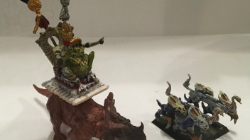 Der Stegadon war um ersten mal im Einsatz, und war verdammt zäh! Ich konnte aber die Skinks mit den Armbrüsten runter schießen, und ab da wussten wir überhaupt nicht mehr, wie wir ihn bewegen sollten 😂