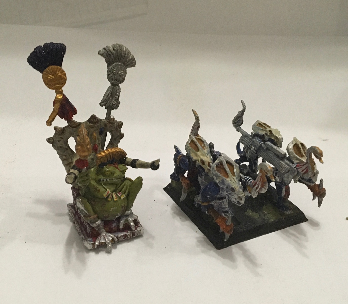 Vor ein paar Wochen hab ich sehr günstige Echsenmenschen aus der alten Starterbox gekauft. Daraus konnte ich 2 Skinkeinheiten machen. Ein paar der Kerle hab ich noch für die Kriegsmaschinen verwendet. Ging sich also sehr gut aus das Ganze!