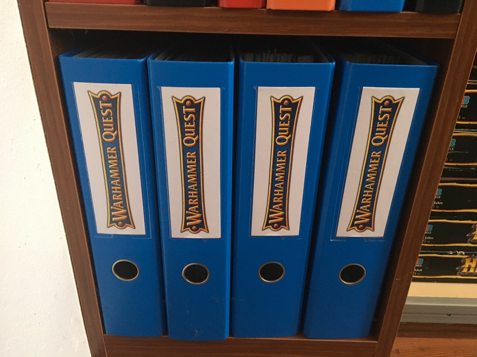 Alles was Dungeon und Regeln betrifft, hab ich in Ordnern gesammelt. Die Dungeon Teile habe ich aus 2mm Karton gemacht. Ich habe sie auch mit Buchschutzfolie beklebt, damit sie länger halten beim Spielen. Um sie zu lagern, habe ich Klarsichthüllen genommen, je 1 A4 Blatt rein gegeben, mit dem Tucker die Kontur der Teile gefertigt, und dann Taschen in die Klarsichthüllen geschnitten. Damit bin ich eigentlich recht zufrieden, jetzt kann ich sie schön verstauen 😊