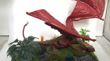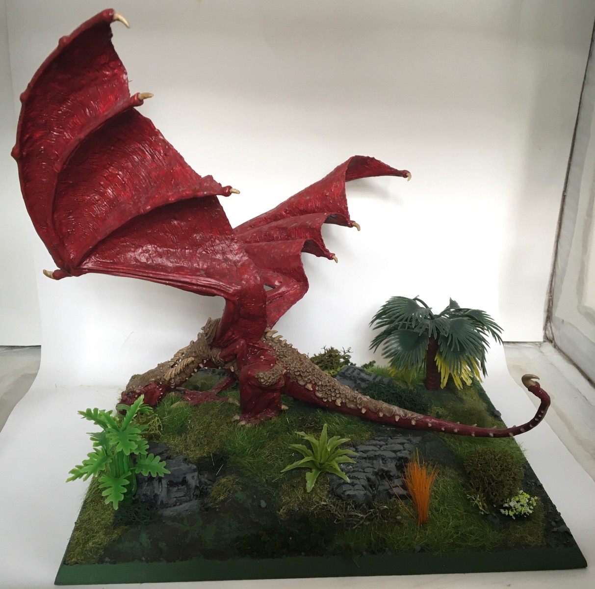 Den Great Spined Dragon hatte ich bereits bemalt und das Base in braun. Also fast wie bei den Orks zuvor. Allerdings habe ich hier deutlich mehr am Base hinzugefügt. Die Palme wurde als Busch verklebt, die kleineren Plastikpflanzen habe ich ins Base verbohrt.