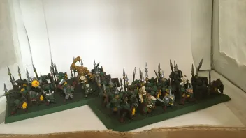 Danach fehlen noch 15 Regimenter Orks, auch wieder gemischt als Bögen, Speere und Handwaffen. Ich hab also deutlich weniger Orks, was ja auch einem Waaaaggh entspricht. Und es stehen dort im Schnitt 17 Modelle am Base, gegenüber den 24 Goblins, womit das Bemalen schneller gehen sollte!