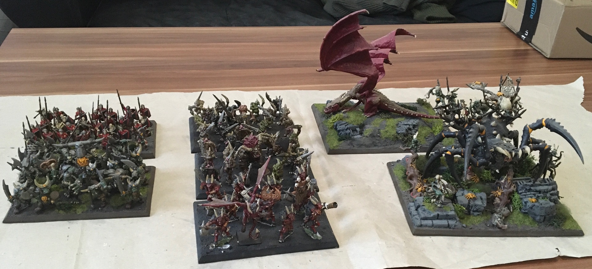 Die Schwarzorks und Skelette gehen bestimmt schnell. Bei den 3 Dämonen Regimentern muss ich vorher noch die Bases reparieren, da sie von mir umpositioniert wurden. Dh ich muss erst noch etwas Löcher stopfen und dazu besanden.