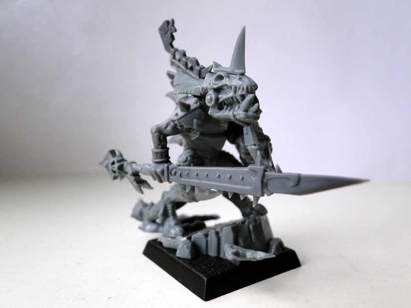 Hat nen Sauruskriegerkörper, nen Sauruskavallerieschild, nen Tempelwachenkopf, eine HW der Kavallerie und Deko aus der Kavallerie und green stuff.