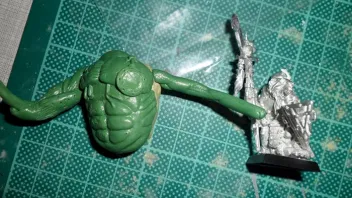 Damit ihr mal seht, wie groß der Kerl tatsächlich wird, hab ich mal nen Kriegsherren zum Vergleich daneben gepackt. Beide wiegen mittlerweile etwa gleich viel.