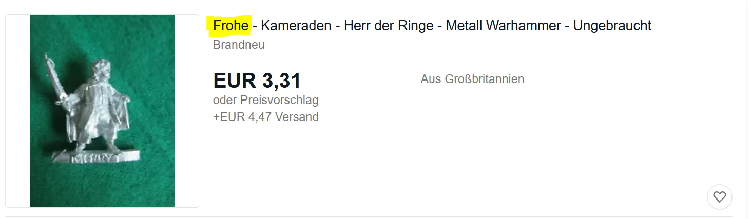 Ich möchte an dieser Stelle den Standpunkt von broncolaine unterstützen. Ich finde es nicht verwerflich oder gar nervig, wenn hier Mitglieder ihre Angebote mit etwas höheren Preisen einstellen. Ich persönlich habe sogar schon bei Alehop etwas gekauft (ein großes HdR-Bundle). Der Preis war nicht sehr niedrig aber ich habe in dem Bundle einige OVP-Boxen aus Metall erhalten, die anderswo zu weit überzogenen Preisen angeboten werden, wenn überhaupt, denn die Boxen gibt es quasi gar nicht mehr MINT auf dem 2nd-hand Markt: Wetterspitze, Flucht vom Orthanc, Amon-Hen. Er ließ sich sogar auf ein 'geteiltes Risiko' ein. Das heißt, ich habe eine Hälfte der Kaufbetrages als Vorauszahlung geleistet und die zweite Hälfte nach Erhalt der Ware. Die Kommunikation war zu allen Zeitpunkten höflich und aufmerksam. Ich war mit dem Deal zufrieden.