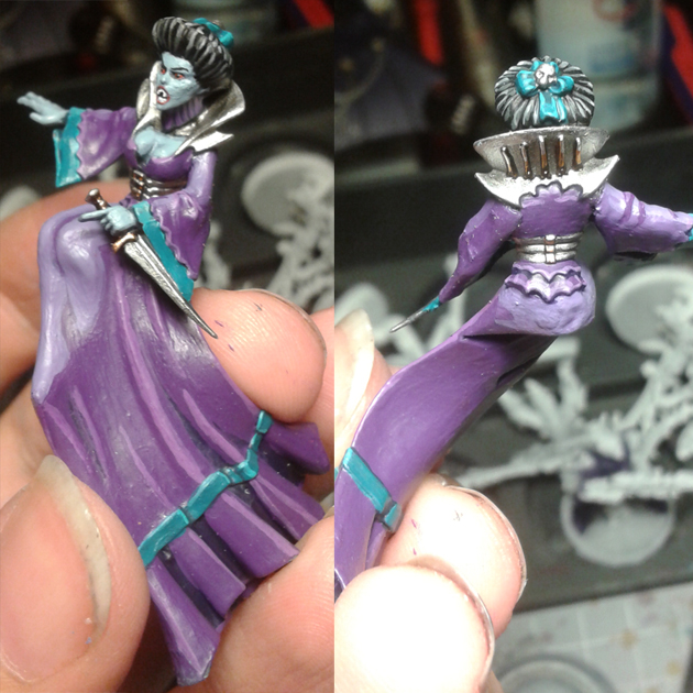 Durch stark verdünnte Farben und zig Schichten. Für das Kleid zB würde ich nur vier Farben nehmen: das Lila als Grundton, ein dunkles Lila für die Schatten, ein helles Lila und Weiß für die Highlights. Evtl noch Schwarz, falls die Schatten nicht tief genug werden. Alles weitere machst du durch unterschiedlich stark konzentrierte Farbschichten. Diese Technik nenn man übrigens Lasieren.