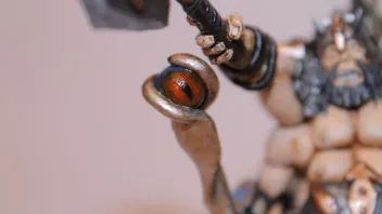 Die Augen ganz schwarz machen mit einem Spiegelpunkt so wie bei den Edelsteinen könnte auch wirken.Und dann noch ein hellen Akzent auf das gesicht setzen. Bzw mit dunklem Bran verdünnt Narbengewebe oder Falten je nach dem was du besser findest. Hoffe kannst damit was anfangen.