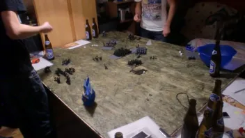 Wir haben 4 Spanholzplatten zum zusammenstecken, die jeweils 48"x24" sind und spielen meistens auf 3 Platten davon - die letzte wird dann meistens noch zum abstellen verwendet (für 6000 Punkteschlachten haben die 72" von 3 Platten breite bisher gereicht, auch wenns fürs Imperium eng wurde