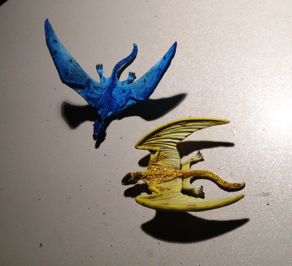 also hab mal ein Bild hochgeladen von zwei Teradons (blau und gelb) Die Vögel wollte ich Bunt halten damit ich einen krassen Kontrast zum rest der Armee habe. Hoffe es gelingt ;)