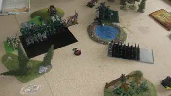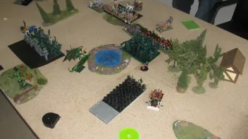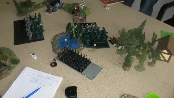 In der linken Flanke greifen die Todeswölfe die Wolsreiter im Rücken an und die Ghulhorde greift die T und den OWB an. In der Magiephase werden Trefferwürfe wiederholen und Erstschlag auf die Ghule erfolgreich, aber auch mit totaler Energie gewirkt. Der hoch motivierter und todeslüsterne Vampirfürst wirft 2mal eine 3 und danach nochmal eine 3... Nunmehr sind also die Vampire ohne General und verlieren noch weitere 14 Ghule durch die Auswirkung des Kontrollverlustes. Auf der Seite der O&G stirbt der Wurm und 1 Troll daran. Danach verlieren die Ghule den NK um 7 wohingegen in der linken Flanke die Todeswölfe mit den Gruftschrecken den NK gewinnen, danach flieht der Goblin-CB 7“, und wird von den erlahmten Todeswölfen (6“^^) nicht eingeholt.