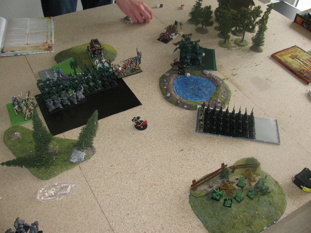 Nunmehr gesellen sich auch der OWB auf Wurm und ein Wolfstreitwagen zu dem NK bei den Trollen und auf der linken Flanke greifen 2 Wolfstreitwagen (Front) und die 6 Wolfsreiter (Flanke), denen sich der Goblin-CB angeschlossen hatte, die Gruftschrecken an. Gork will wiedermal mit totaler Energie (LP-Verlust bei Wildorkschamane wieder gerettet) auf dem Gegner rumtrampeln, doch leider kann er, nachdem er den Mortis-Schrein + Leichenkarren + 5 Ghule trifft, nur 4 Ghule ausschalten. Trolle + Wolfstreitwagen + OWB auf Wurm gewinnen den NK wie erwarten klar und positionieren sich neu in Richtung der Ghulhorde. Im NK auf der linken Flanke gibt es zu wenige Aufpralltreffer durch die 2 Wolfstreitwagen und so verlieren die Gruftschrecken insgesamt 6 LP, wogegen 1 Wolfstreitwagen + 1 Wolf sterben, am Ende ein NK-Sieg um 1 für die O&G. Ach ja, die KK haben ganz vergessen ihren todesmutigen Goblin auf Sturzflug zu schicken und dabei standen Mortis-Schrein + Nekromant + Ghule sooo schön beieinander…