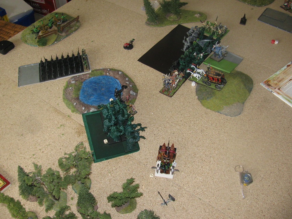 Nunmehr gesellen sich auch der OWB auf Wurm und ein Wolfstreitwagen zu dem NK bei den Trollen und auf der linken Flanke greifen 2 Wolfstreitwagen (Front) und die 6 Wolfsreiter (Flanke), denen sich der Goblin-CB angeschlossen hatte, die Gruftschrecken an. Gork will wiedermal mit totaler Energie (LP-Verlust bei Wildorkschamane wieder gerettet) auf dem Gegner rumtrampeln, doch leider kann er, nachdem er den Mortis-Schrein + Leichenkarren + 5 Ghule trifft, nur 4 Ghule ausschalten. Trolle + Wolfstreitwagen + OWB auf Wurm gewinnen den NK wie erwarten klar und positionieren sich neu in Richtung der Ghulhorde. Im NK auf der linken Flanke gibt es zu wenige Aufpralltreffer durch die 2 Wolfstreitwagen und so verlieren die Gruftschrecken insgesamt 6 LP, wogegen 1 Wolfstreitwagen + 1 Wolf sterben, am Ende ein NK-Sieg um 1 für die O&G. Ach ja, die KK haben ganz vergessen ihren todesmutigen Goblin auf Sturzflug zu schicken und dabei standen Mortis-Schrein + Nekromant + Ghule sooo schön beieinander…