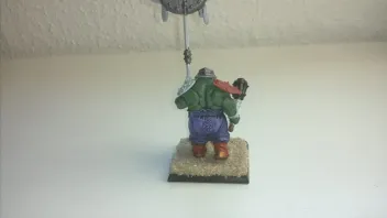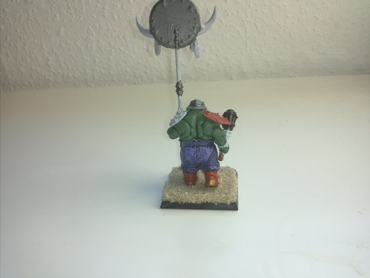 • Ogre #6: Eisenwanst (Standartenträger)..bei diesem habe ich etwas mehr Spaß bei der Bemalung, als bei den bisherigen zwei Eisenwänsten. Ich hatte eigentlich an ein eher gräuliches Hautschema gedacht und zunächst mit Grau + einen kleinen Tropfen Dunkelgrün angefangen, doch dann anschließend mit Thakka Thakka Thukka Green gewasht, was ihn sehr grün hat werden lassen. Beim Schichten werde ich trotzdem immer mehr Grau reinmischen.