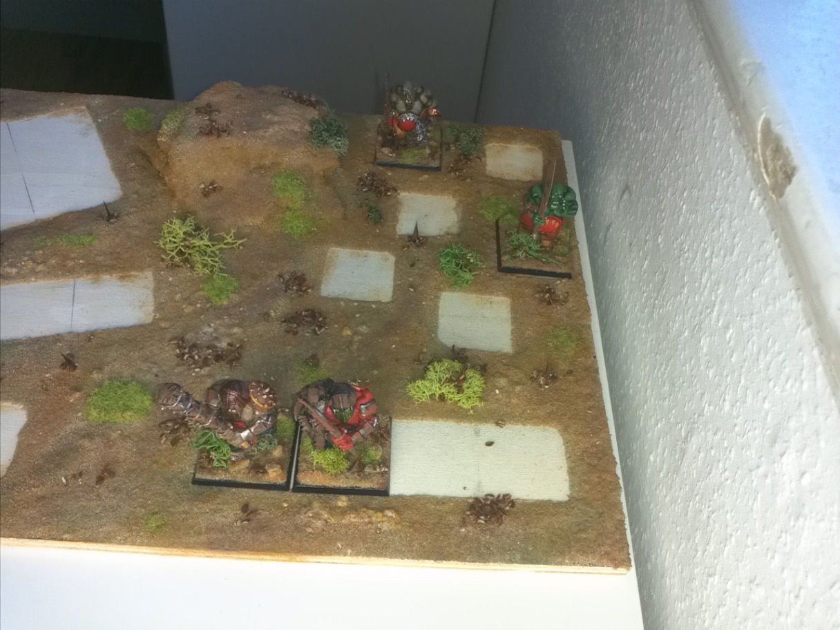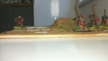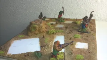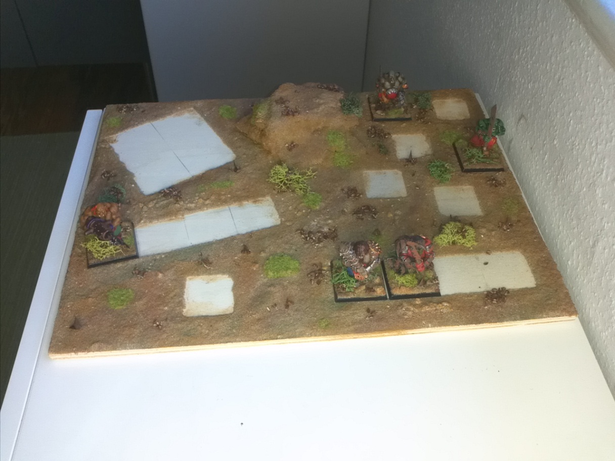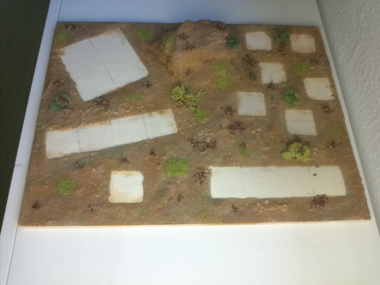 Danach habe ich die Platte wie bei meinen üblichen Bases mit Vogelsand belegt und noch einen Hügel aus Pappstückchen zusammen gebaut. Bemalung und weitere Gestaltung wie üblich :O