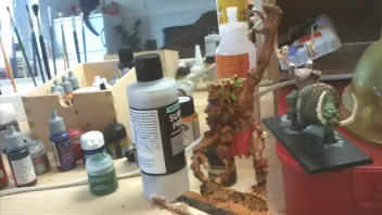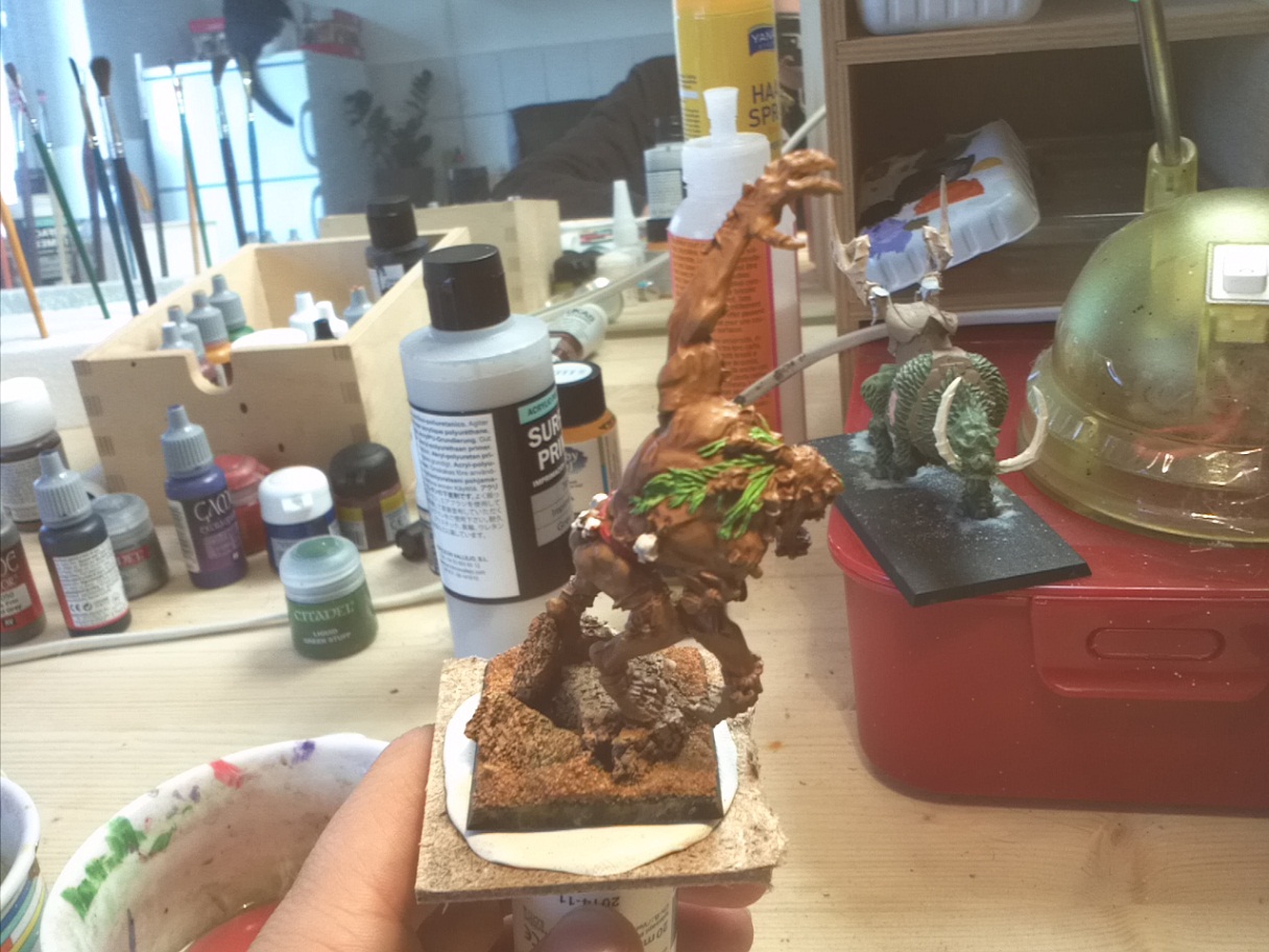 Bases: Leim + Vogelsand, anschließend klebe ich immer noch ein paar grobkörnigere Steinchen von Dekosand aus dem 1 €-Laden drauf und wende eine bunte Bemalung an (orange, braun, grün, rot, elfic flesh) und klebe dann Gras + Sommermoos von The Army Painter drauf. Anschließend Leinsamen (kann man auch essen :tongue: ) und diese Dornen von den Stachelpflanzen draußen drauf 8)